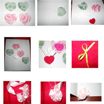 Step-2Tie out small ribbon and decorate your card, now take pink ribbons and make flowers with it and glue around your card (See photo).